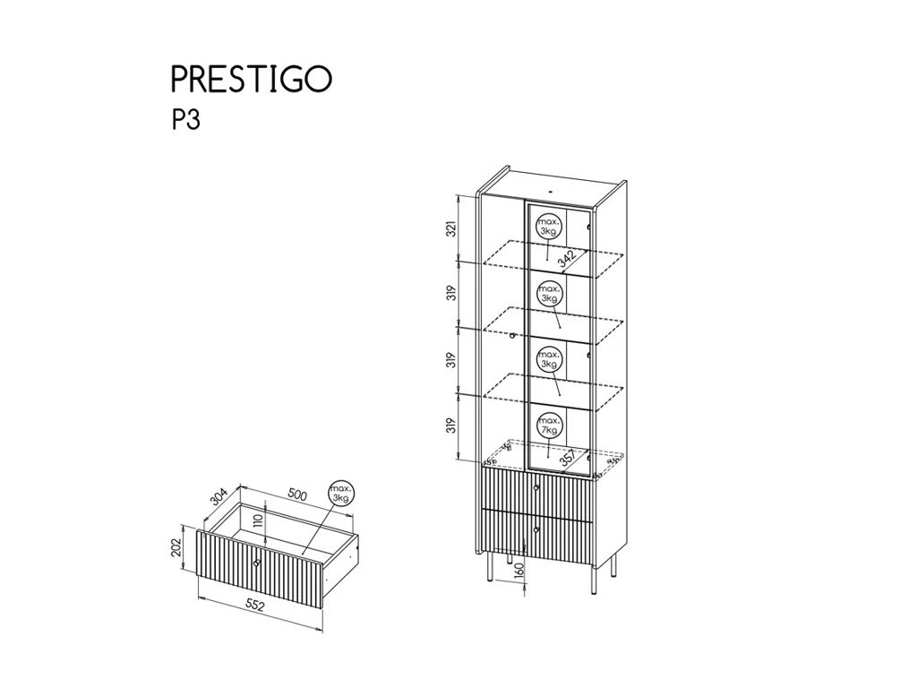 Prestigo P3 je štýlová vitrína kombinujúca presklené dvierka a praktické zásuvky. Je ideálna na vystavenie dekorácií alebo skla a zároveň poskytuje úložný priestor v spodnej časti. Moderný dizajn s čiernymi akcentmi dodá interiéru jedinečný charakter.