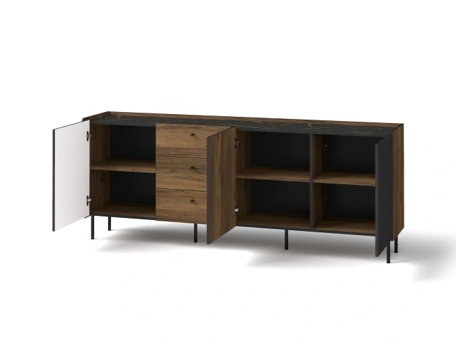 Zostava Prestigo je štýlovým riešením pre spálne, obývacie izby aj pracovne. Kombinuje moderný dizajn s prvkami v dekore dreva a tmavými akcentmi, ktoré dodávajú interiéru eleganciu a útulnosť. Nábytok je vybavený praktickými úložnými priestormi, vhodnými pre knihy, dekorácie alebo pracovné potreby, a ponúka dostatok miesta na pohodlné usporiadanie každej miestnosti.