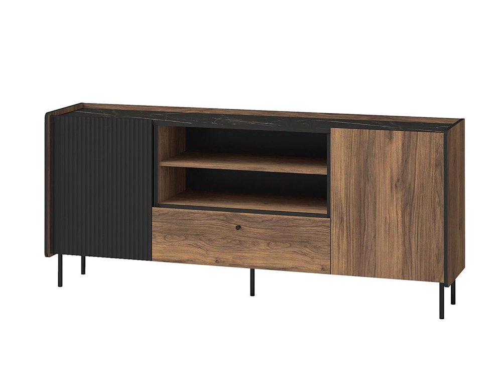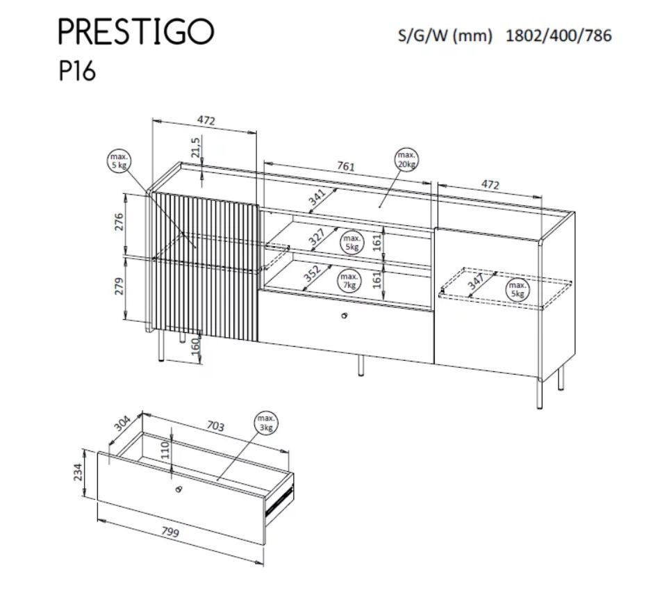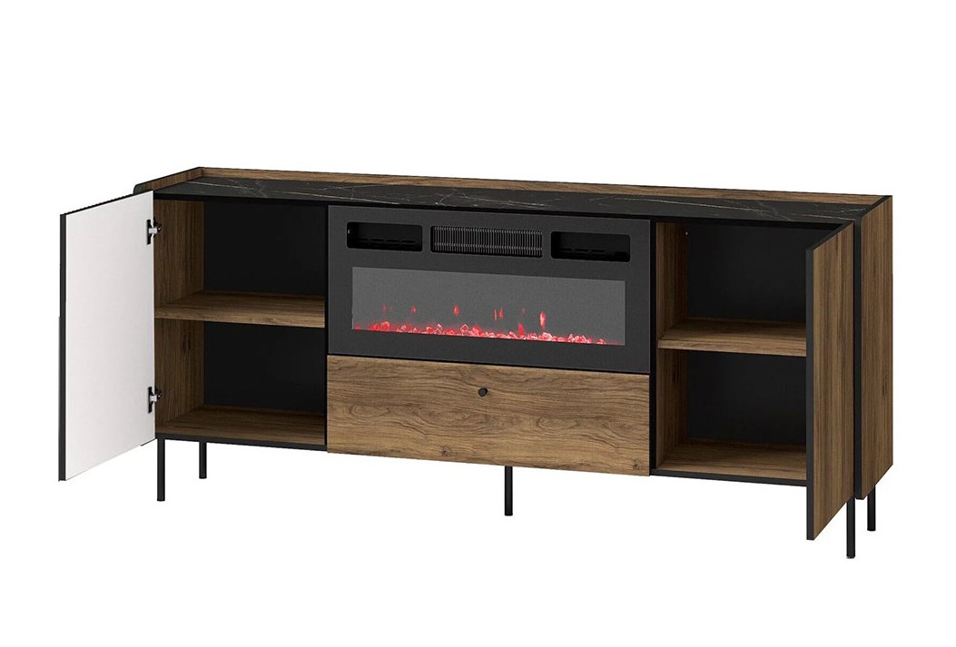 Prestigo P16 je moderná skrinka, ktorá kombinuje praktické úložné priestory s elegantným dizajnom. Predné dvierka majú zaujímavý pruhovaný dizajn v tmavej farbe, ktorý vytvára kontrast s dreveným dekorom. Krb nie je súčasťou.