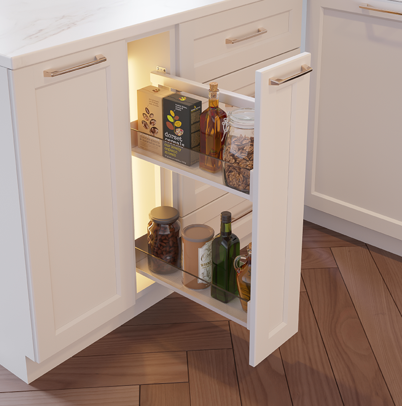 Univerzálny výsuvný cargo kôš do dolných otváracích skriniek s jedným dvierkom 20-40 cm bez zásuviek. Montáž na dvierka.