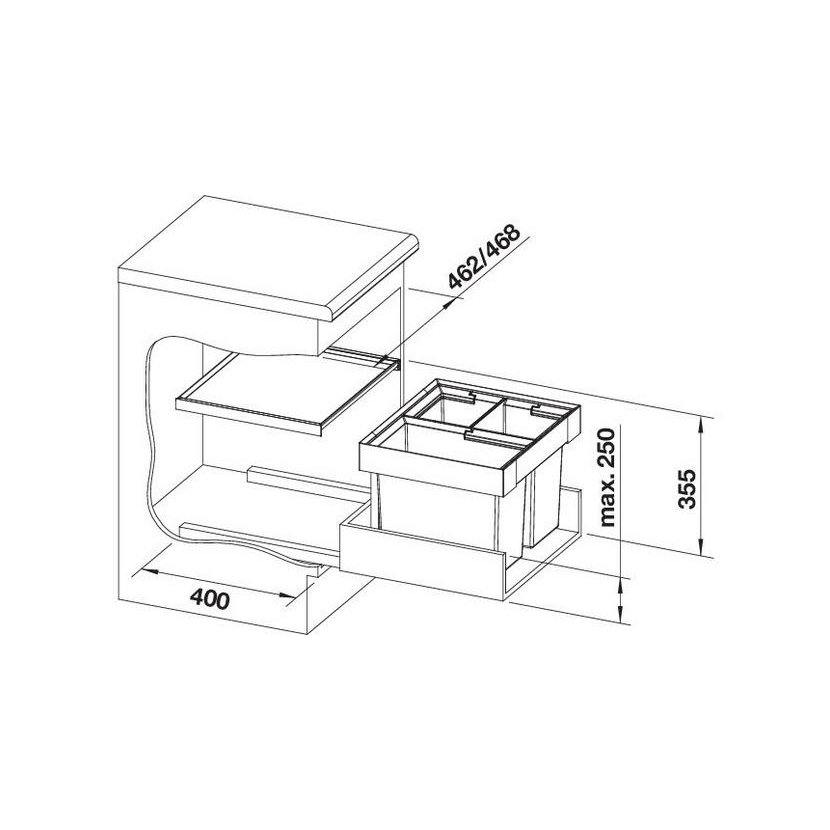 - výška zabudovania 355 mm od dna zásuvky, hĺbka zabudovania 400 mm