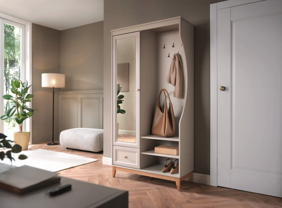 Predsieňová stena Windo so svetlým zrkadlom je súčasťou nábytkového radu Windo, s ktorým vkusne vybavíte obývaciu izbu a jedáleň.