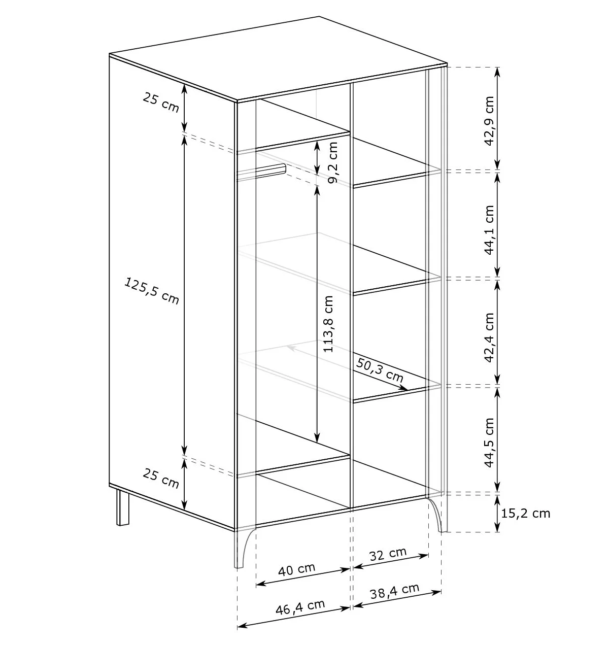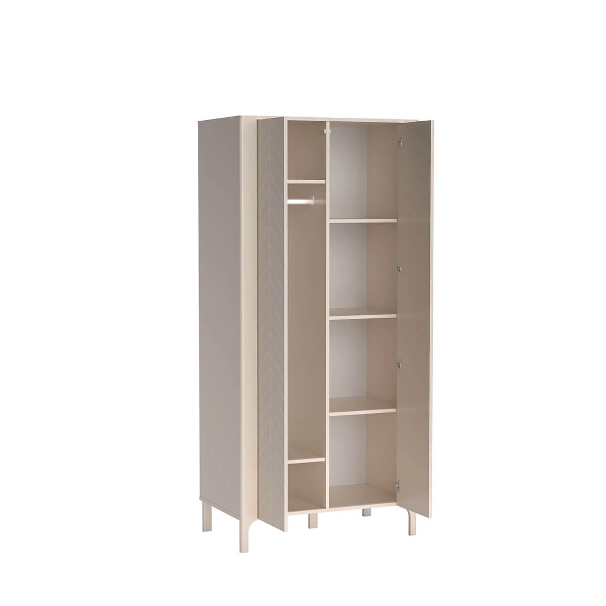 Skriňa MALMI spája elegantný minimalizmus s praktickým riešením úložného priestoru. Prevedenie s geometrickým vzorom rybej kosti dodáva interiéru moderný charakter. Ponúka priestor na vešiaky, štyri police aj spodnú časť vhodnú na topánky alebo tašky. Kvalitná matná nábytková doska zaručuje dlhú životnosť a ideálne sa hodí do moderných aj industriálnych interiérov.